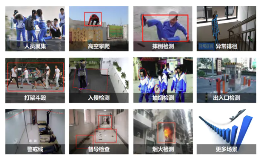 •�?安全防护场景*:火焰检测、烟雾识别、人员跌倒检测、安全帽佩戴识别