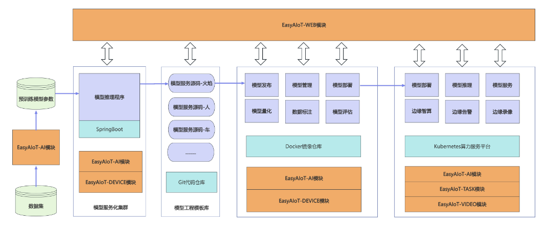 EasyAIoT的最大优势之一就是其灵活的部署方式。五个核心模块既可以整体部署,也可以根据实际需求独立部署。这种设计让平台能够适应从云端大规模集群到边缘受限设备的各种环境�?